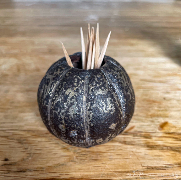 This Japanese iron and silver gourd has always been a toothpick dispenser, first at my parent's house and now here. It is actually quite a beautiful thing and probably has some value.