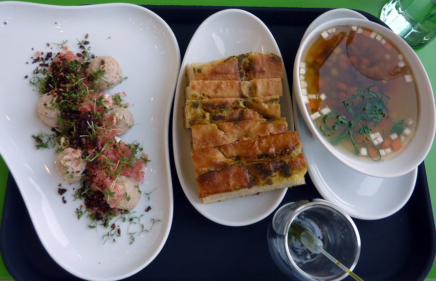 Cods roe - herring pate with rye bread crumbs, focaccia, olive oil, oxtail soup (for Lucy).